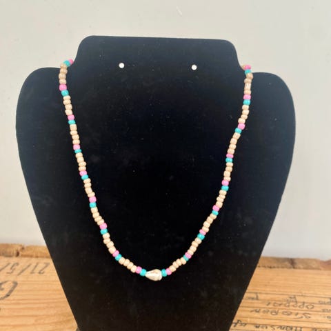 Nydelig perlekjede beige, hvit og turkise toner, med et lite skjell, fra Afrika.