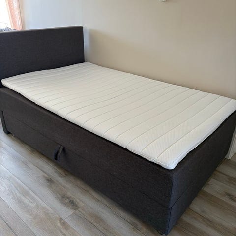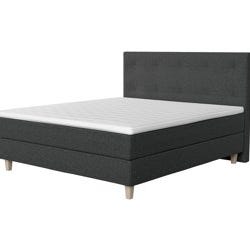 Förvaringssäng i grått textil med huvudgavel. Sängen har en lyftmekanism som ger förvaringsutrymme under liggytan. Huvudgavel och madrass.