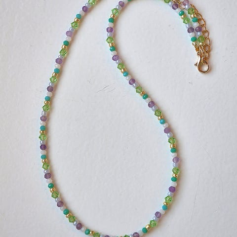 Nydelig perlekjede i rosa, grønn, lilla, blå og hvite toner..