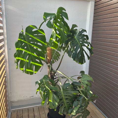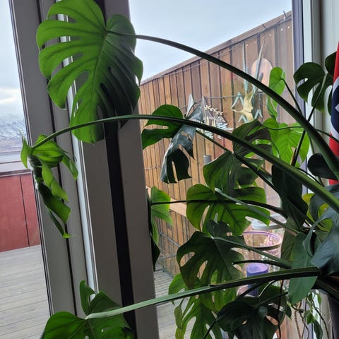 Monstera deliciosa potteplante i grønn farge. Planten har store, flikete blader og er plassert i en potte. Egner seg som inneplante i stue eller andre rom med indirekte lys. Krever jevn vanning og trives i normal romtemperatur.