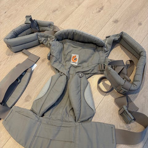 Ergobaby Omni 360 bæresele i grå farge. Bæreselen har polstrede skulderstropper og bred, justerbar hoftebelte med støtte. Den kan brukes i flere bæreposisjoner, blant annet mage mot bærer, utovervendt, på hofte og på rygg.