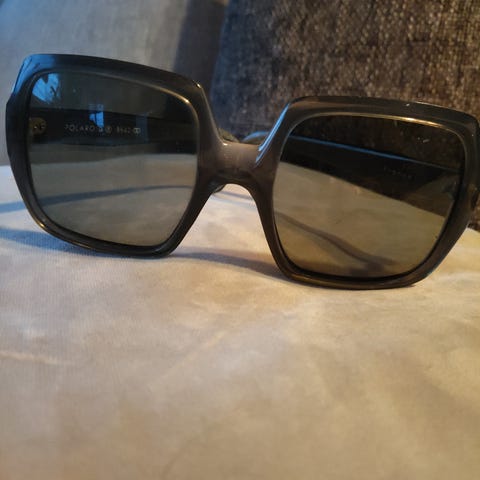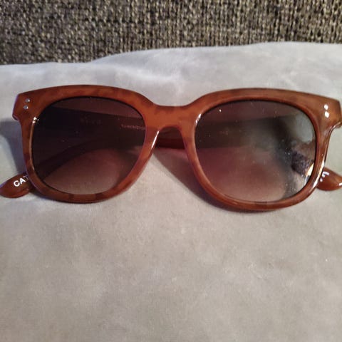 Solbriller med rektangulær innfatning. Brillene har burgunder plastinnfatning og brune glass. Passer til dame, og kan brukes som solbriller eller som motebruk avhengig av glass og styrke. Formen gir et markert uttrykk og dekker godt rundt øynene.