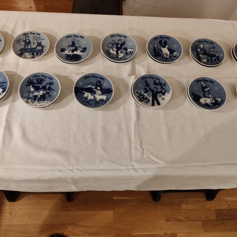 Samling med Mors Dag–platter fra 1970 til 1982, totalt 13 platter. Motivene varierer fra år til år og viser klassiske, nostalgiske scener med barn, dyr og gårdsliv i blått og hvitt.