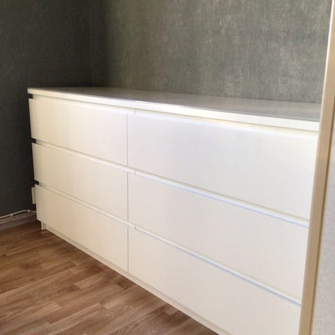 IKEA kommode i hvit utførelse. Kommoden har fire skuffer med glatte fronter og et enkelt, moderne uttrykk. Passer til oppbevaring av klær, tekstiler eller andre gjenstander på soverom, gang eller stue. Overflaten er rett og kan brukes til å plassere lamper, dekor eller andre mindre ting. kan leveres mot tillegg.