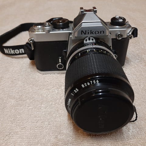 Nikkormat analogt kamera utstyrt med: Nikkor-S auto 1:2.8 f=35mm objektiv, Hanimex Tele-auto 1:4.5 f= 200mm, mellomringsett Soligor auto extension tube nikon, Nikon veske og reim, solskjerm, snorutløser, uv-filter og fotobag. Kameraet er mye brukt, men pent håndtert. Antagelig produsert ca 1970. Ikke vært brukt på mange år. Helt i orden da. Vipps eller kontant.