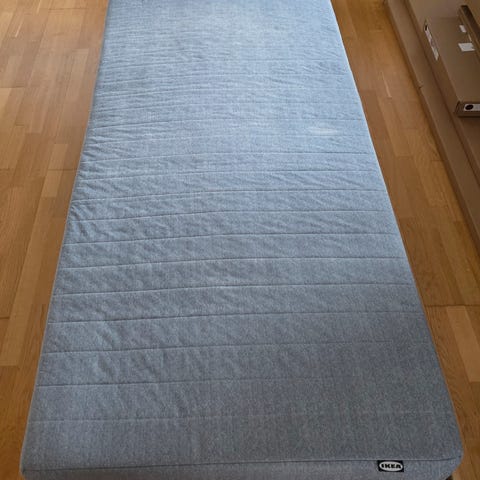 Seng med oppbevaring i grått tekstil med hodegavl. Sengen har en løftemekanisme som gir oppbevaringsplass under liggeflaten. Hodegavl og madrass.