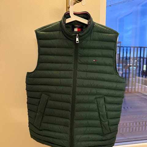 Ubrukt Tommy Hilfiger dunvest for herre i størrelse XL. Vesten er oransje og fylt med dun og fjær. Lett, myk og komprimerbar (packable), egnet som et ekstra isolerende lag. Modellen har glidelås i front, ståkrage med karakteristiske Tommy Hilfiger-detaljer og sidelommer.