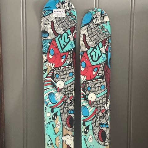 K2 twintip ski med Marker bindinger. Farge gull/blå. Passer perfekt til de som liker å kjøre i parker og som vanlig alpint. Ski bør preppes før bruk.