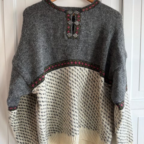 Hjemmestrikket ullgenser, klør ikke. Størrelse M. Mønster på den ene siden så da kan man velge hvilken side som er foran og bak. Farge: blå