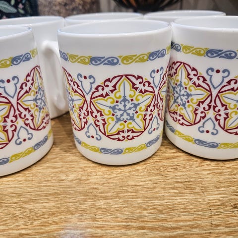 4 stk krus med fot i porselen (finn.no sier Ittala, men vet ikke om det stemmer) med flerfarget dekor. Motivet består av fugler, blomster og geometriske elementer i rødt, gult, blått og grønt på hvit bunn. Krusene har hank og bred fot som gir en stabil base. Egnet til servering av varme og kalde drikker. På én av krusene er det en liten nagg/skade i kanten, som vist på bilde