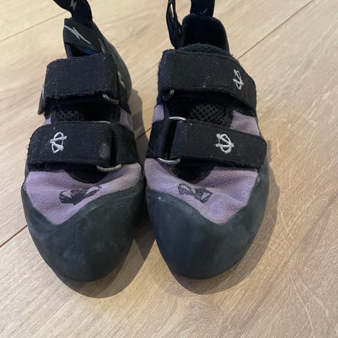 Jeg selger klatreskoene fordi de er for små for meg. Selv har jeg størrelse 45 til vanlig, og bruker ofte klatresko i størrelse 44. Kan hende det ikke var det rette paret for mine føtter, men kanskje for dine?