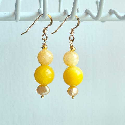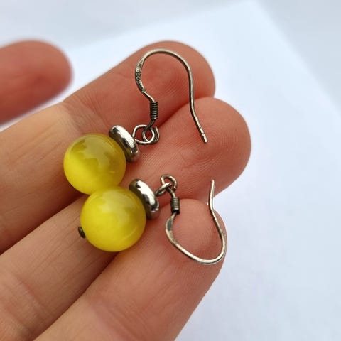 Ny, håndlagd ørepynt / øredobber selges. Alt materialet (metallet) er ekte 925 sterling sølv. Vakre perler av gul jade! Størrelsen på perlene er 10 mm. Allergivennlig.