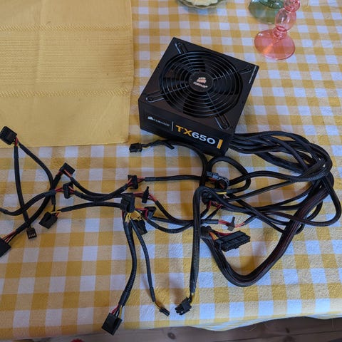 Corsair TX650 strømforsyning med effekt på 650 watt. ATX-strømforsyning i svart utførelse med stor kjølevifte på toppen for luftgjennomstrømning. Modellen har flere faste kabler for tilkobling til hovedkort, prosessor og andre komponenter i en stasjonær PC. Egnet for bruk i vanlige ATX-kabinetter som krever en 650W PSU.