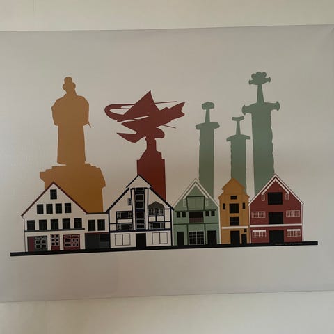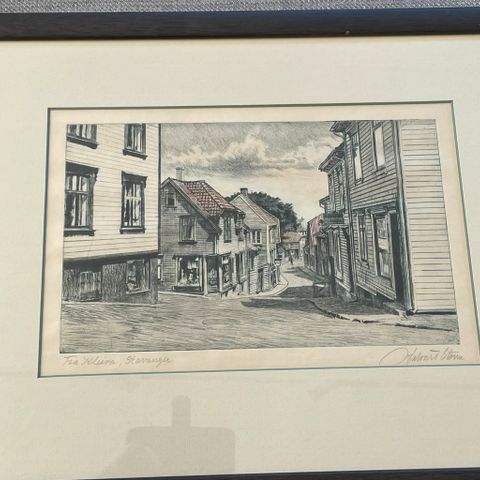 Sig Jacobsen bilde (originalen er i privat eie)med motiv av den travle havnebyen Stavanger med skip, kraner, bygninger og mennesker. Bildet er signert «Aug Jacobsen» og datert 1930 nede i venstre hjørne. Maleriet er innrammet i en enkel treramme. På baksiden av rammen er det stempel fra M. Andreassen Rammeforretning, Kirkegata 20, Stavanger. Motiv og farger går i lyse blå-, brun- og rødttoner. Egner seg som veggkunst i stue, gang eller kontor.
