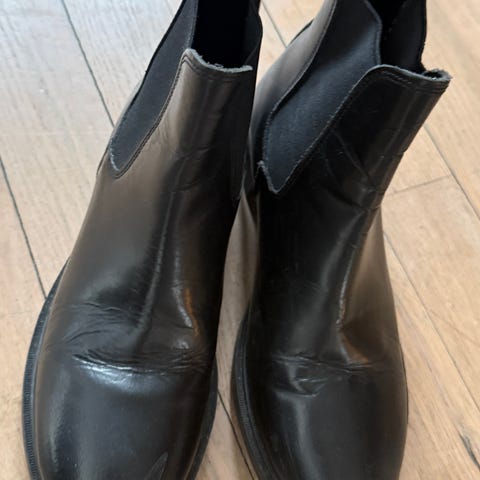 Klassisk ankelhøy modell med elastikk i sidene. Glatt overdel og lav hæl. Str 37. Pent brukt.