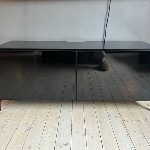 Bestå tvbenk fra Ikea med glassdører, glasshyller og lys. Farge er eikemønster.