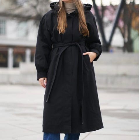 Part Two kåpe for dame i størrelse M/38. Lang, svart kåpe i ullmateriale med dobbeltspent lukking og knytebelte i livet. Kåpen har klassisk krage, lange ermer med stroppdetalj ved mansjettene.