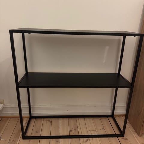 Selger et konsollbord fra Søstrene Grene. Det er sort men har et lite snev av mosegerønt i seg avhengig av lys. Godt brukt så det er litt overfladiske bruksmerker, men det er stødig og har ingen store mangler- mye bruk igjen. Følger med ei metallhylle og blomsterpotte.