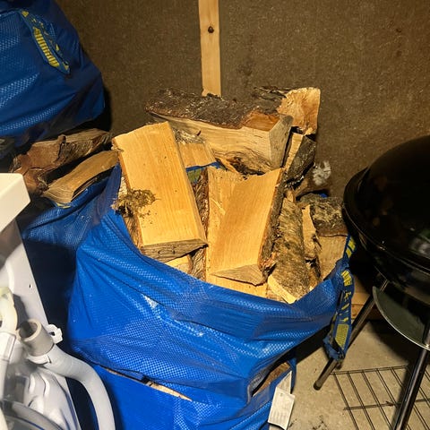 Ved stablet på pall. Sekkene inneholder kappet og kløyvd ved, egnet til bruk i peis, ovn eller annen vedfyring. Oppbevart utendørs under presenning.