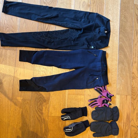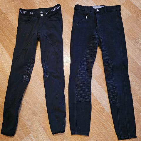 5 pent brukte ridebukser/tights str 150, ingen bruksmerker. En ridevest og et par chaps