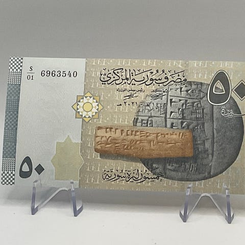Central Bank of Syria 200 Syrian Pounds seddel. Syrisk pengeseddel med pålydende verdi 200 syriske pund. Forsiden viser arkitektoniske motiver og landskap, baksiden har dekorative mønstre og tekst på engelsk og arabisk. Egner seg til samling av utenlandske sedler eller som illustrasjon av syrisk valuta.