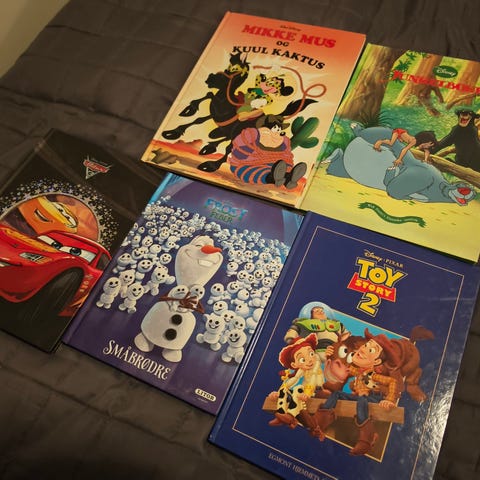 Historier med Mikke Mus, Aladdin, Tazzan og andre kjente Disney-figurer. Bøkene er illustrerte bildebøker egnet for barn, med stive permer og fargerike tegninger. Passer som høytlesningsbøker eller for barn som leser selv.