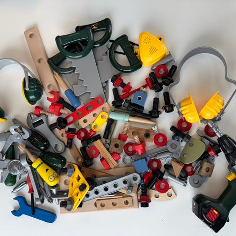 Verktøysett i tre med belte fra New Classic Toys. Litt brukt av et barn, masse bruk igjen. Anbefalt alder 3-7 år. Ny pris 379,-