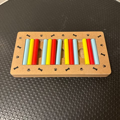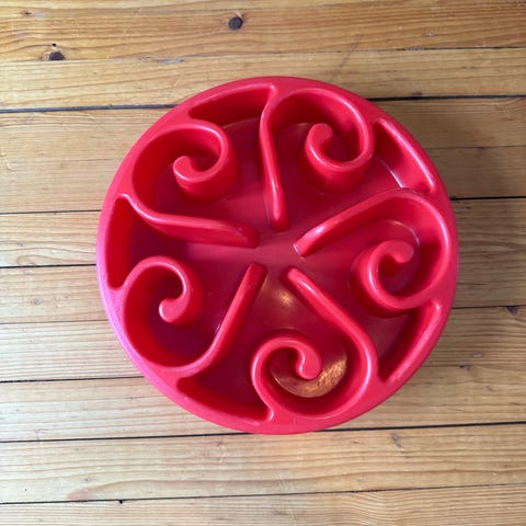Dog Activity aktivitetsleke til hund i rød plast. Rund plate med flere utsparinger for å skjule godbiter. Undersiden har sklisikre føtter for stabilitet på gulvet. Egnet som mental aktivisering for hund ved søk etter godbiter eller tørrfôr.