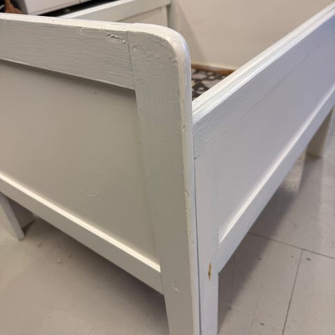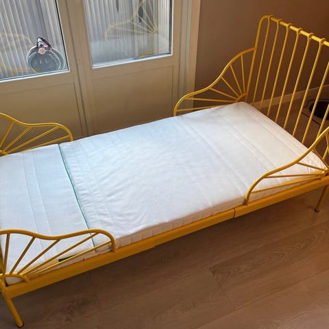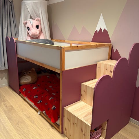 Barna vil ha køyeseng derfor selger vi våre to IKEA juniorsenger i metall i rosa farge. Sengen har høye gavler med spiler og lave sidekanter som gir en åpen følelse samtidig som barnet får noe støtte ved sidene. Rammen er laget av metall med lakkert overflate.