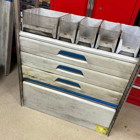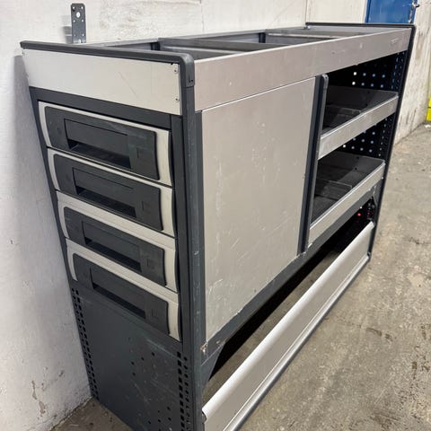 Varebilinnredning fra Sortimo selges, brukt med noen små sår, ellers i grei stand. Den er 105cm lang, 130cm høy og 30cm bred. Har stått bak i kort hiace, passer de fleste varebiler.