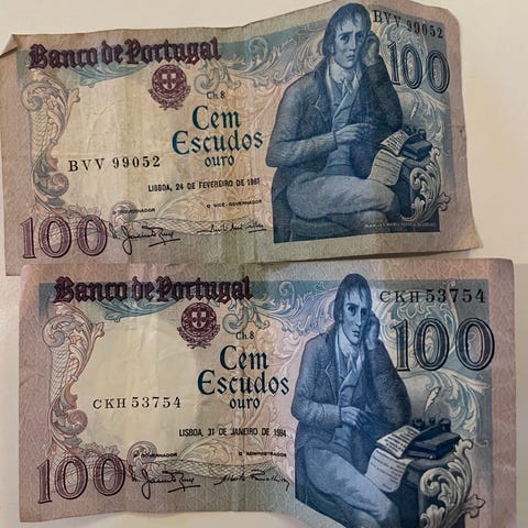 Banco Central da Guiné-Bissau 100 pesos seddel. Forsiden viser portrett og dekorative mønstre, med pålydende verdi 100 pesos og teksten «Cem Pesos». Baksiden viser en bygning samt pålydende verdi og landets navn. Seddelen egner seg som samleobjekt for numismatikere og for dem som samler på utenlandske pengesedler.