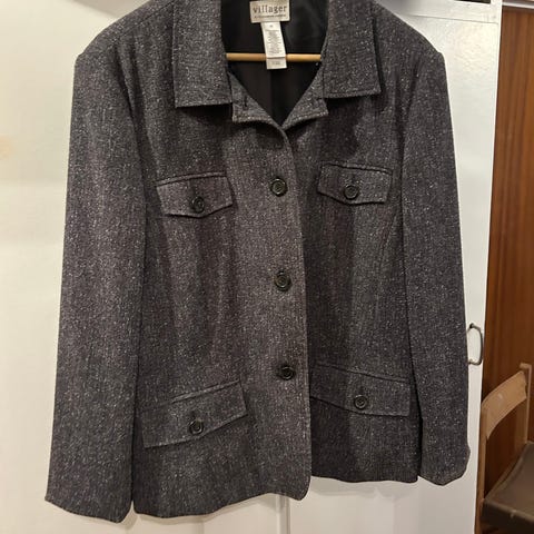 jakke for dame i størrelse 44. Jakken er svart/hvit med vevd mønster og har krage, knappelukking foran og to frontlommer med klaff. Lengden går til rundt hoftepartiet, og modellen har lange ermer. Materialet fremstår som et vevd stoff egnet til bruk inne eller som lett ytterjakke i overgangssesonger.