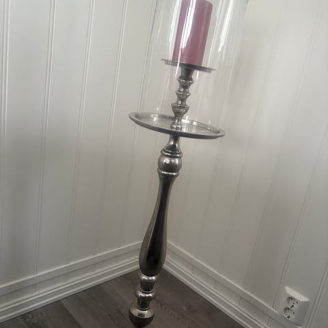 Lysestake med glassylinder . Lysestaken står på en dekorativ fot av tre , med en sylinderformet glassbeholder på toppen. Inni glasset er det plassert kongler og en kunstig plante. Men egner seg også veldig godt til kubbelys. Totalhøyden er rundt 1,05 meter, egnet som gulvdekorasjon i stue, gang eller andre oppholdsrom. Produktet er ment til innendørs bruk som dekorativ innredningsdetalj.