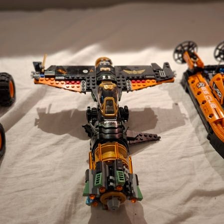 Lego Technic flysett med turkise og oransje deler. Settet består av byggeklosser og tekniske elementer som kan brukes til å bygge flymodeller som vist på bildet. Passer for bygging, lek og som tillegg til andre Lego Technic-sett.