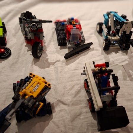 Lego Technic byggesett med ulike kjøretøy og et fly. Settet består av flere deler som kan settes sammen til blant annet et fly og andre kjøretøylignende modeller. Delene er i hovedsak i fargene oransje, svart og gult, med enkelte detaljer i andre farger. Egner seg for bygging, lek og som supplement til andre Lego Technic-sett.
