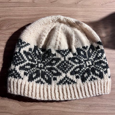 Nydelig strikket lue fra Manndalen i Nord Troms, med samisk mønster. Alle fargefelt er vakkert brodert på.