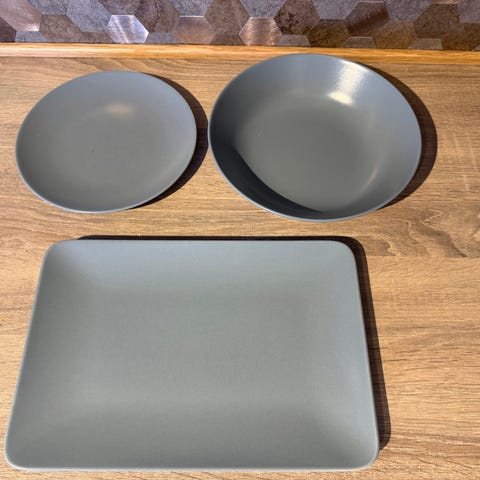 IKEA tallerkener og skåler i svart steingods. Sett med flate tallerkener og dype skåler i ensfarget, matt svart utførelse. Passer til daglig bruk på kjøkkenet, til servering av middager, supper, frokost eller snacks. Nøytralt design som kan kombineres med annet servise.5 middag asjetter, 6 frokost asjetter,4 jupe asjetter og 6 kaffekopper med skåler