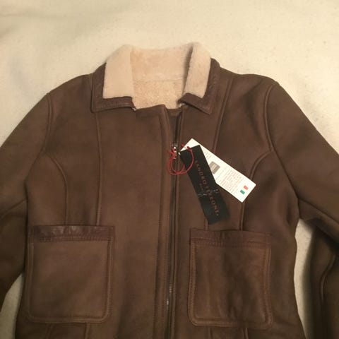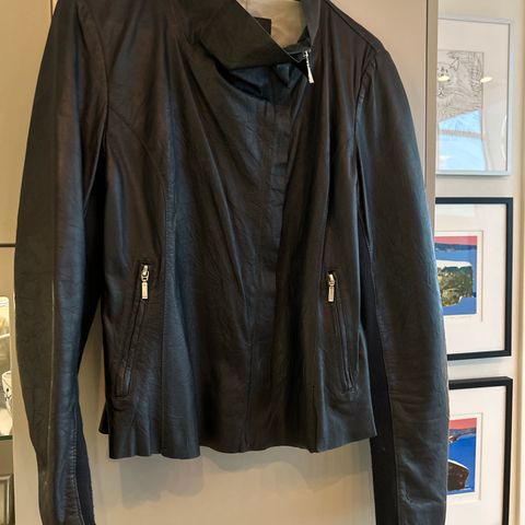 Mørkeblå skinnjakke fra Sergio Beninni til salgs. Str M. Pent brukt, ingen merker. Klassisk.