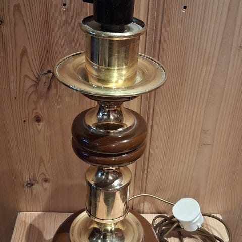 Veldig pen og spesiell lampe med original skjerm, kobber med smidde bein. I katalogen (Mats Linder) fra 1965 er lampen beskrevet slik: 9168 Kobber "beholder " og sorte ben. Skjerm skotskrutet. H. med skjerm 32cm.
