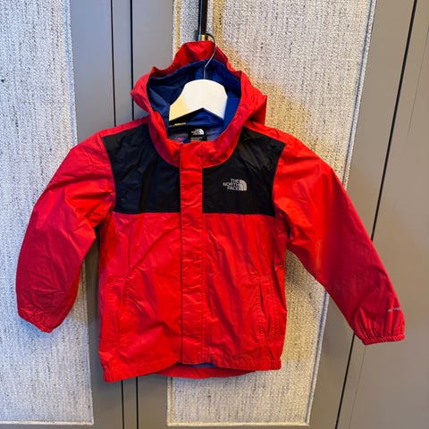 The North Face jakke for barn i størrelse 92. Jakken er i rosa polyester med grå detaljer og hette. Innsiden har fôr med flerfarget mønster. Modellen er unisex og egner seg til hverdagsbruk og utendørsaktiviteter for små barn.