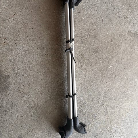 Mitsubishi takstativ / takbøyler i aluminium. Usikker på om de heter WingBar evo eller Whispbar. Med sølvfargede bæreprofiler og svarte føtter. Stativet består av to tverrstenger som festes i bilens takfester / rails. Egnet som base for montering av for eksempel takboks eller andre takmonterte holdere, avhengig av kompatibilitet med aktuell Mitsubishi-modell. Nøkkellås er integrert i foten for å sikre stativet til bilen. 2 stk nøkler.