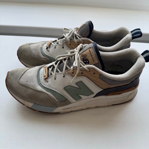 New Balance ML574NN sneakers/joggesko i størrelse 46. IKKE EKTE!!! Modellen har overdel i tekstil og syntetisk materiale i olivengrønn og brune nyanser, med karakteristisk New Balance-logo på siden. Yttersåle i gummi med mønster for grep. Passer som fritidssko og til hverdagsbruk.