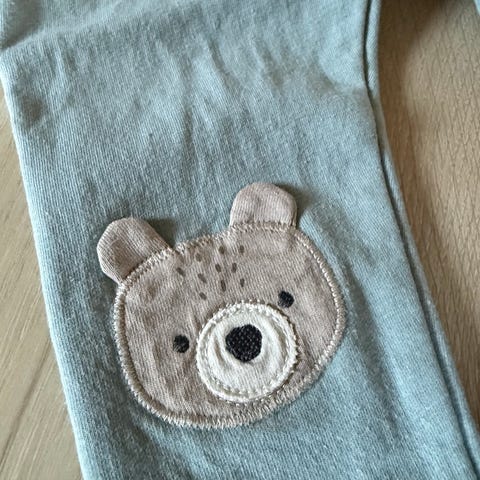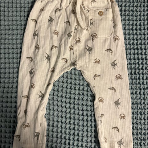 Newbie bukse for barn i størrelse 86. Buksen er i beige bomull og har unisex passform. Den har strikk i livet og ribbekanter nederst på beina for bedre passform. Materialet er myk bomull som egner seg til hverdagsbruk for barn i alderen ca. 1–2 år. Med dinosaurer på.