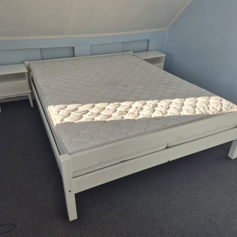 Sengen er ca 15 år gammel, men fremstår fin. Den ene rammen er knekt tidligere men reparert med en planke/forsterkning på innsiden og fungerer fint. Nypris var ca 15.000 kr den gang. Sengen er demontert og må hentes. Se bilder for info.