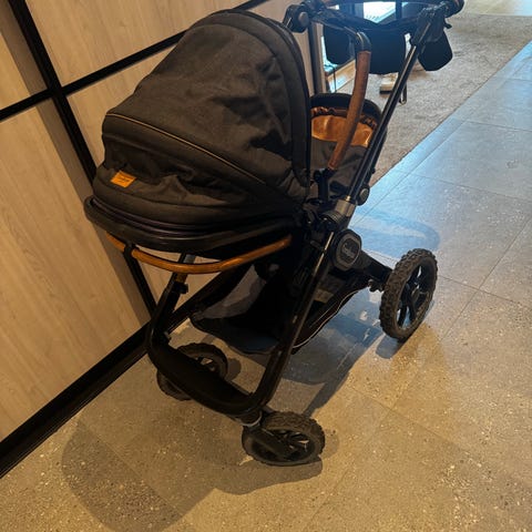 Emmaljunga barnevogn i kombivognløsning med både liggedel og sittedel. Vognen har klassisk understell med fire store hjul og varekurv under. Tekstiler i mørk farge med lys innside i liggedelen. Sittedelen har justerbar rygg og integrerte seler. Håndtak og ramme er i metall med polstret håndtak. Egnet til bruk fra nyfødt med liggedel og videre som sportsvogn med sittedel.