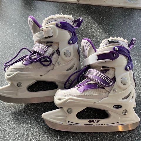 Graf barne skøyter i størrelse 27-30. Skøytene har hvit og lilla overdel med lisser, borrelåsrem og spennelukking for god tilpasning rundt foten. Overdelen er polstret for økt komfort og støtte til ankelen. Sålen er utstyrt med metallskinne til bruk på is. Passer til barn som trenger stabile skøyter til generell skøytebruk på isbaner og uteis.