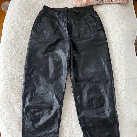 Svart skinnbukse kjøpt i London. Står str 16, anslår det til ca 42.