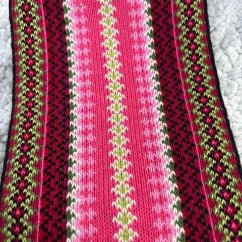 Nydelig håndstrikket genser i norsk rent ullgarn på tynne pinner og er et lett plagg. Fargen er mørk rosa med hvitt mønster, samme mønster foran og bak og har båtutringing. Genser ble feil i størrelse og har aldri vært brukt…
