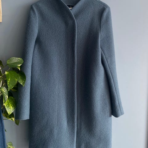 COS ullkåpe for dame i størrelse 38. Kåpen er grå/beun og laget i ullblanding ifølge vaskelappen. Den har klassisk krage, knappelukking foran og to frontlommer. Lengden går omtrent til kneet, avhengig av høyde. Egnet som yttertøy i kjøligere vær.