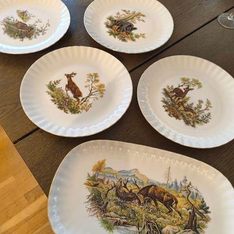 5 stk middagstallerkener. 1 etasjefat og 1 telysholder . Alt er helt og fint uten skader . Talerkner 250kr pr stk . Etasjefat 500kr , lysfat kr 350. Samlet pris ved kjøp av alt 1900kr